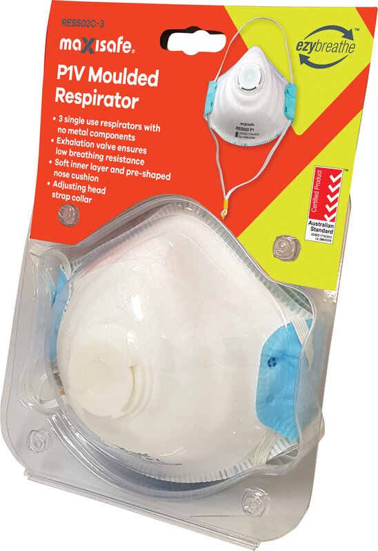 The Maxisafe RES502C-3 card of 3 P1 Moulded Respirator with Valve delivers dependable respiratory protection against mechanically generated dusts, mists, and non-toxic airborne particles. Certified to AS/NZS 1716:2012 (P1) standards, this respirator is ideal for use in construction, maintenance, agriculture, and general industrial environments where comfort and breathability are essential.